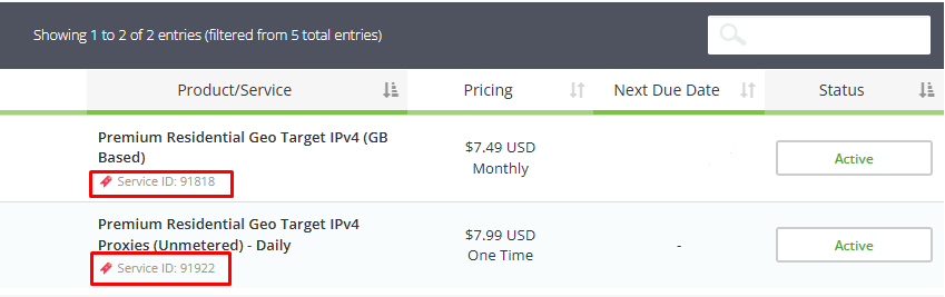 On your Home page, under the Your Active Products/Services section, you will find all your active plans. Below each service name, the Service ID is displayed.