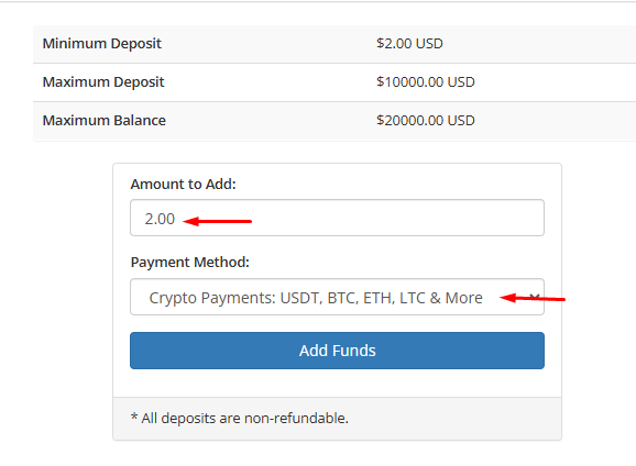 Make sure to enter the exact amount you want to add and complete the payment using a supported cryptocurrency, such as USDT, BTC, ETH, LTC, and more.