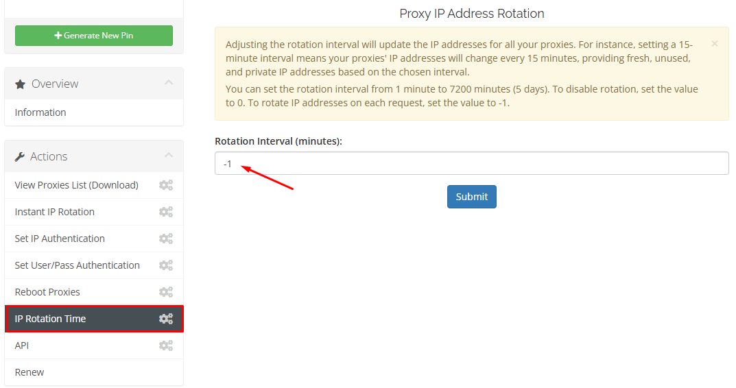 The proxies IPs are automatically changed once you set the rotation time that you want. For example, if you choose 1 minute the proxies' IPs are going to change automatically every 1 minute without you having to do that every time. You can set the time to anything between 1 and 7200 minutes.