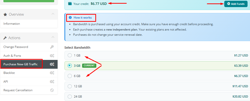 Go to your dashboard and select "Purchase New GB Traffic", then choose the required GB amount and complete the process.